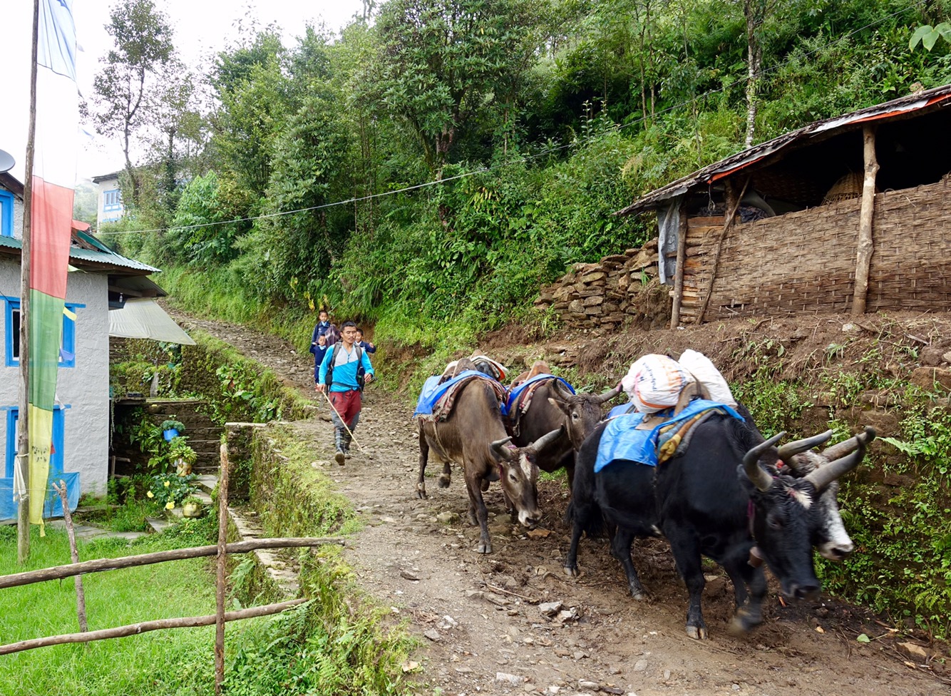Noch ein letzter Tag waren wir auf der einsamen, ursprünglichen Route zum Everest Trek. Morgen werden wir auf die touristische Route ab Lukla einbiegen. Der heutige Weg führte uns von Kharikhola 2100m über den Kari La Pass 3080m nach Paiya (Chutok) 2730m. Auf dieser Versorgungsroute für’s Everestgebiet haben wir einige Packtiere und Träger mit nicht ganz suvakonformen Lasten gesehen (angeblich 65 bis 80kg)…