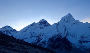 Nach einigen Nebeltagen, standen genau heute, an DEM Tag, um 4h früh glitzernde Sterne am Himmel. Mit warmen Klamotten und montierter Stirnlampe ging’s in frostiger Kälte hoch auf den Kala Patthar (5550m). In zwei Stunden waren die 400hm, nicht ganz schmerzfrei, überwunden. Pünktlich zum Sonnenaufgang um 6.15h standen uns Everest, Nupse & Co. gegenüber, auch das Tibet zum greifen nah. Danach ein stärkendes Frühstück in unserer Übernachtungslodge in Gorakshep (5140m) und anschliessend folgte der 1100m Abstieg nach Dingboche. Dieser war ein Genuss, da die noch beim Aufstieg wolkenverborgenen, weissen Riesen sich jetzt in voller Montur zeigten.