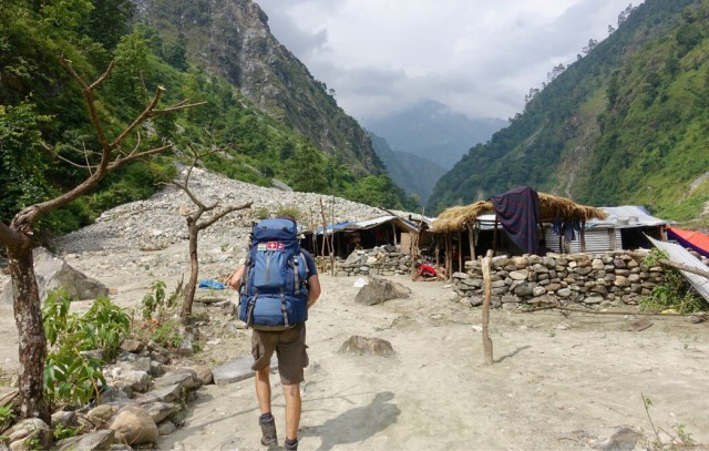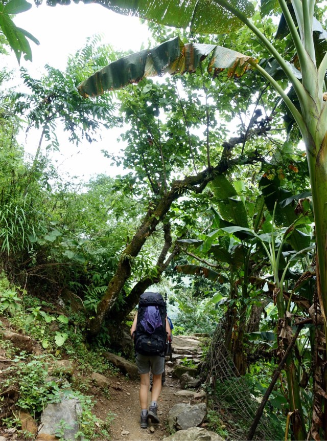 Nach heftigem Monsunregen in der Nacht, der sich als Sprühpieling bis auf’s Bett wagte, starteten wir bei feuchttropischen Temperaturen ab Soti Khola (620m). Jetzt ein Gratistipp: Wer bis 15h in Soti Khola ankommt (Ende der Strasse), sollte die 2 Std. Marsch bis Lapubesi noch bei Tageslicht in Angriff nehmen, da es dort bedeutend schöner ist.