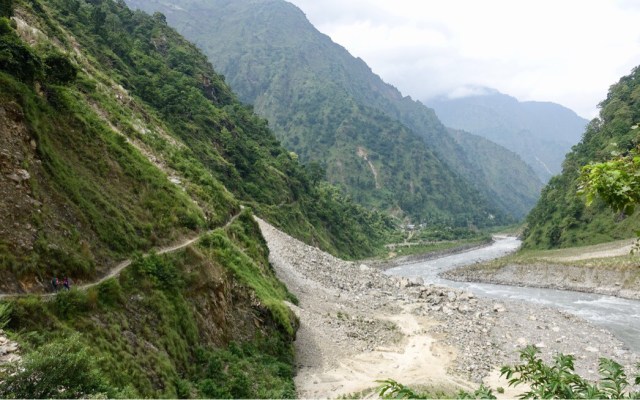 Viel Schweiss wurde heut vergossen. Auch mussten einige gröbere Hangrutsche und „Wasserfallen“ umgangen werden, bis zum Tagesziel Machhakhola (820m), immer dem Fluss (Budhi Gandaki) entlang.
