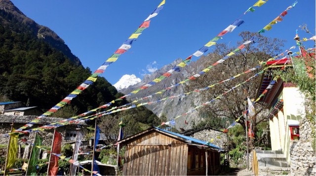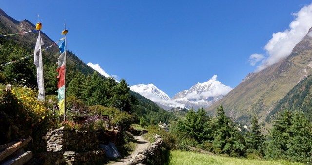 Bei stahlblauem Himmel und kühlen Morgentemperaturen ging’s von Namrung weiter dem Fluss entlang Richtung Lho (3200m). Bereits gegen Mittag wurde unser Ziel mit mayestätischer Kulisse sichtbar. Stahlblauer Himmel, schneeweisser Manaslu, Kloster Nyingmar und darunter das hübsche Dorf Lho.