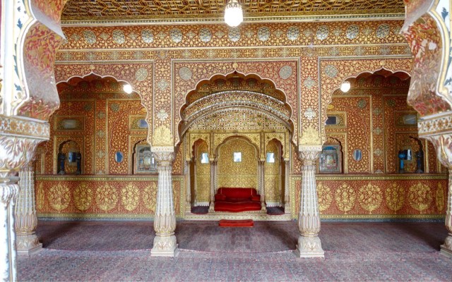 200km in 4h, zuerst etwas holprig, dann aber auf einer überraschend gut ausgebauten, gebührenpflichtigen Strasse geht’s immer mehr in Richtung Wüste Thar. Die Stadt Bikaner (600’000 Einw.) ist nicht wirklich touristisch erschlossen, dafür kann man sich noch richtig preisgünstig und schmackhaft am Strassenrand verpflegen. Höhepunkt der Stadt ist der Junagarh Fort, eine gepflegte Palastanlage, die auch wirklich ihr Eintrittsgeld wert ist (Anmk.: westliche Touristen werden bei manchen, ach so tollen Attraktionen geschröpft – häufig nur heisse Luft!).