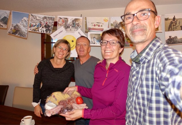 Nach den zwei mehr oder weniger angenehmen Flügen pünktlich um 6:30h in Zürich angekommen. Mehr oder weniger angenehm, weil es im ersten Flug einen ziemlich unangenehmen Zwischenfall gab. Der Sitznachbar von Nadja hat nach dem Essen gleich wieder alles erbrochen (ohne Tüte!). Glücklicherweise gab es hinten im Flugzeug noch freie Plätze, so dass wir uns umsetzen konnten. In Zürich angekommen wurden wir durch Anita und Werni herzlich in Empfang genommen und nach Hause gefahren. Dort dann eine Überraschung mit bildlichen Errinnerungen an unsere Erlebnisse auf der Reise. Und im Kühlschrank gleich noch eine Überraschung, Käse- / Fleischplättli und Weisswein. Da hatte Nadja schon länger wieder mal Lust drauf. Wurde natürlich gleich gegessen. Jammi, jammi…