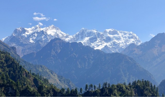 Um 6h wurden wir mit diesem Ausblick aus unserer Cottage in Bimtang (3700m) geweckt. Danach ging’s stetig bergab durch gigantisches Flussgeschiebe und Märliwald nach Dharapani (1900m). Die 3200hm Abstieg der letzten 2 Tage, mit dem Gewicht am Rücken, haben die Knie zum glühen gebracht.