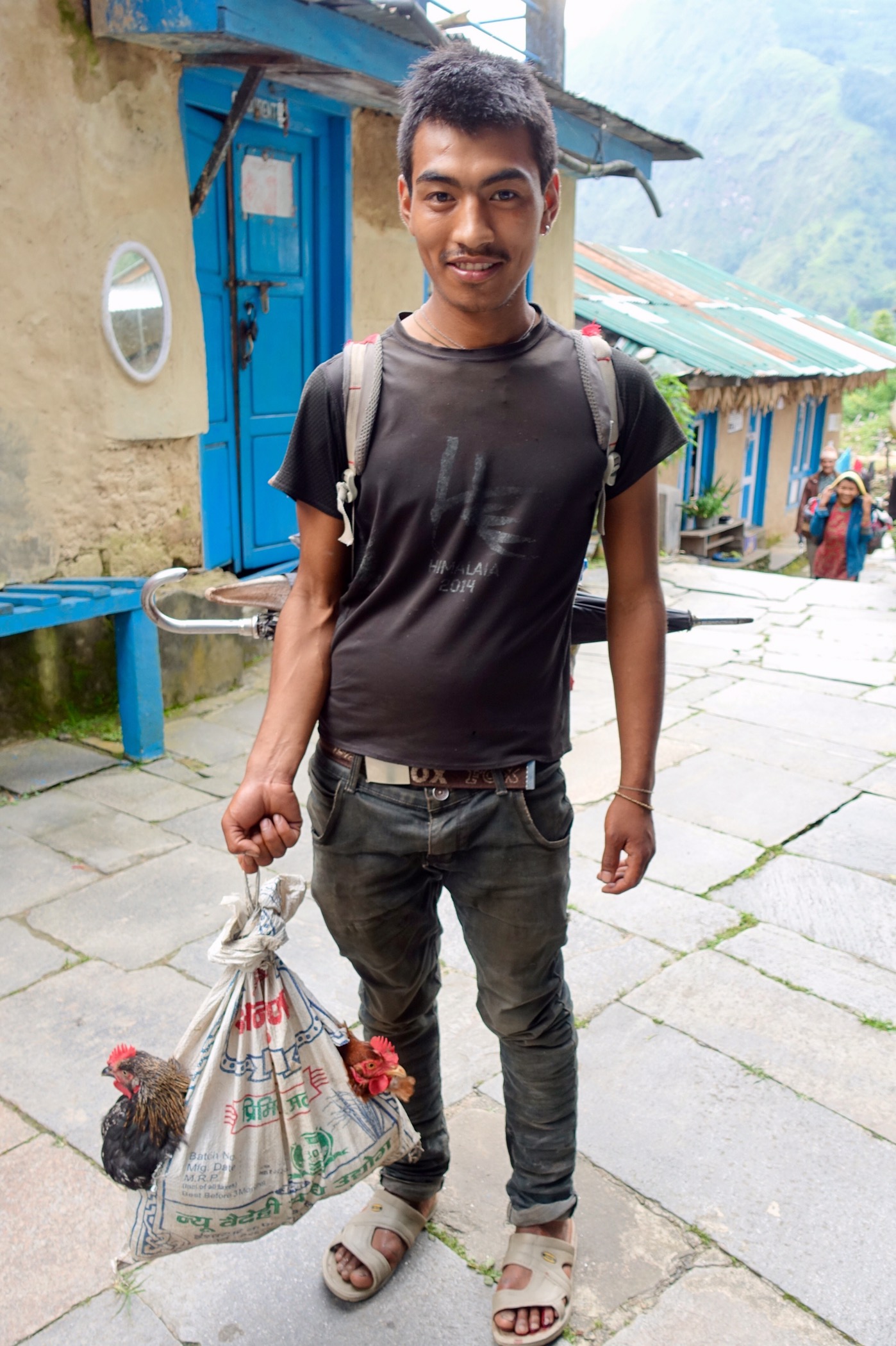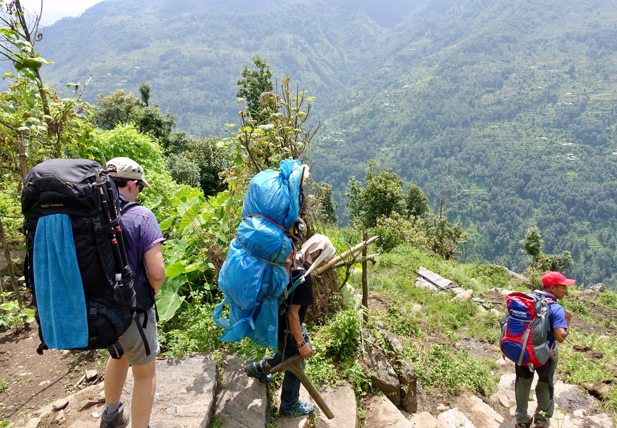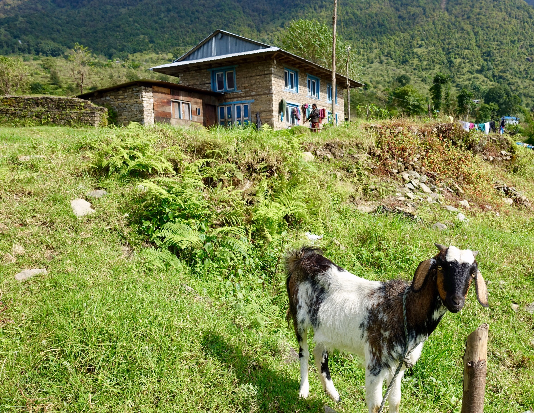 Die 3. Etappe führte uns durch ein sehr ursprüngliches Nepal nach Goyam auf 3’200m Höhe. Die Höhendifferenz von 1’500m gab uns ganz schön zu schaffen. Oben angekommen erwartete uns die einfache, einzige Lodge, Openair Bad mit frischem Quellwasser inklusive. Entschädigt wurden wir durch tolles Panorama und sattgrüne Wälder… wiederum als einzige Trekker auf der Tour.